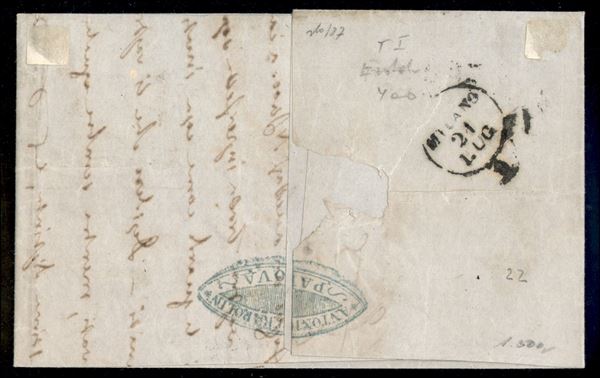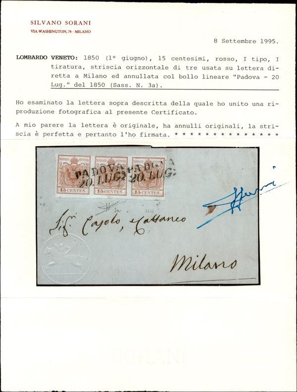 Lettera da Padova del 20.7.1850 per Milano affrancata con striscia di tre del 15 cent prima tiratura carta a mano (3a) - cert. Sorani