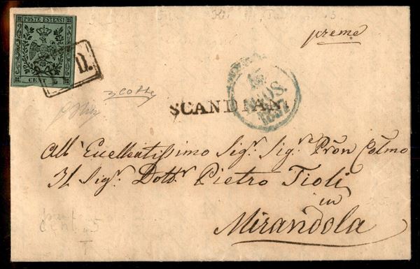 Lettera da Scandiano 13.8.57 affrancata con 5 cent con errore punto spostato verso la cifra (8c) - buoni margini - firma Oliva + cert. Colla