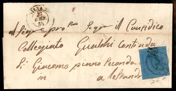 Lettera da Silvano/c 27 GEN.54 per Alessandria affrancata con 20 cent azzurro seconda emissione (5) annullato in transito a Novi - non ci risultano note altre letter da Silvano affrancate con questa emissione - firma Chiavarello