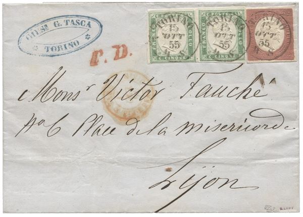 Lettera da Torino 15.10.55 per Lione affrancata con 40 cent rosso mattone pił coppia (toccata a destra) del 5 cent verde pisello mista III°/IV° emissione - RARITA' DI NOTEVOLE FRESCHEZZA - Calves + Samy - (9 + 13c)