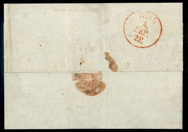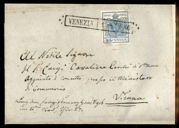 Lettera da Venezia (R50 P.ti 5) del 1.9.1850 per Vienna 8Austria) affrancata con 45 cent primo tipo prima tiratura (10a)