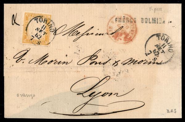 Lettera doppio porto affrancata con 80 cent giallo arancio (17C) da Torino 11 SETT 62 per Lione - qualità SPL