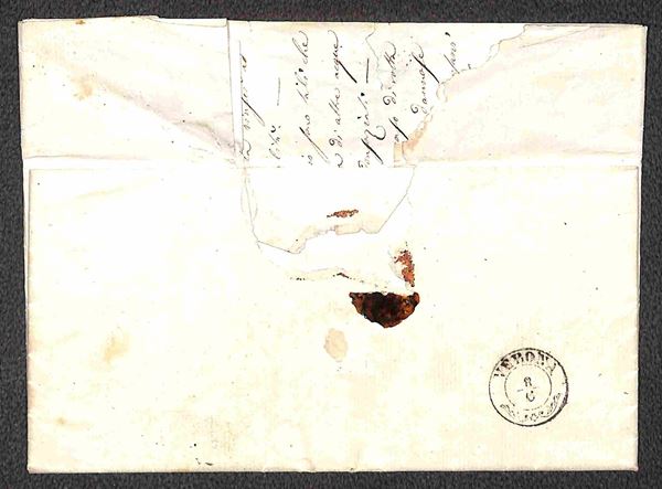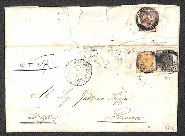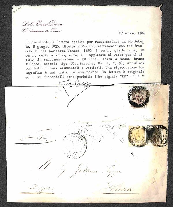 Lettera raccomandata da Montebello 8.6.1856 diretta a Verona affrancata con 5 cent + 10 cent + 30 cent (1 - 2 - 9) tutti carta a mano annullati con bollo a linee orizzontali e verticali (P.ti 5) - cert. E. Diena