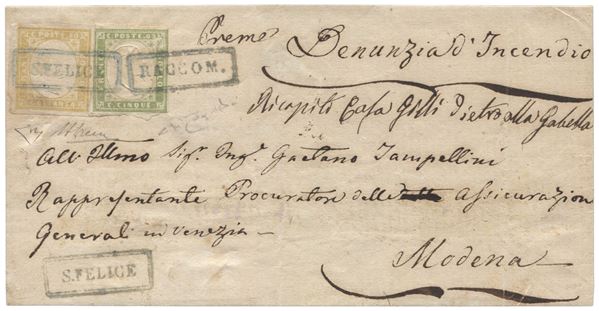 Lettera raccomandata da S. Felice affrancata con 80 + 5 cent bene marginati - annulli nominativo e raccom entrambi in cartella apposti in azzurro - unico caso noto non recensito - Raybaudi + AD + cert. ED - (17Aa + 13Be)