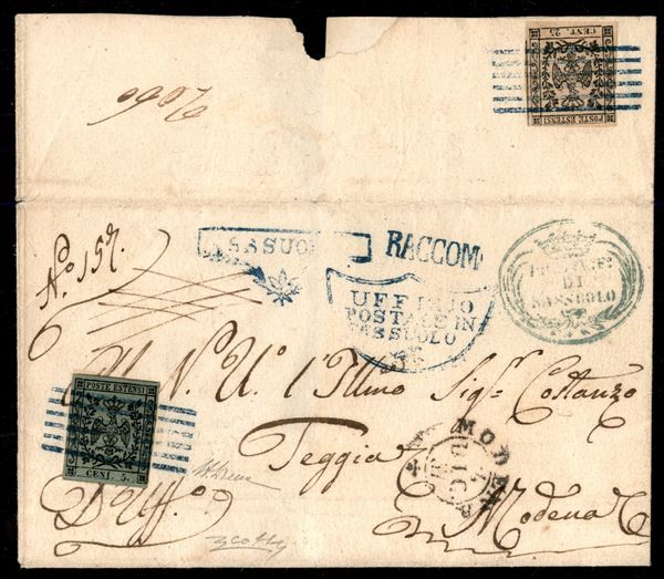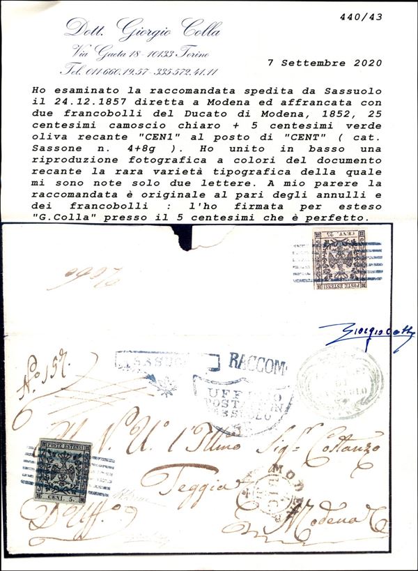 Lettera raccomandata da Sassuolo 24.12.57 affrancata con 5 cent varietą CEN1 pił al verso 25 cent (8g + 4) - buoni margini - annulli azzurri - firma A.Diena + cert. Colla