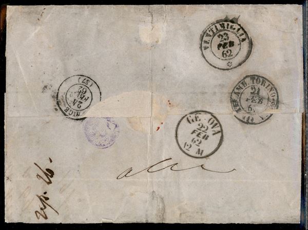 Lettera tre porti affrancata con tre esemplari del 10 grana arancio (22) da Napoli al porto 19 FEB 62 per Nizza viaggiata via mare sino a Genova e bollo d'ingresso "Italie 2 Menton" per il confine di Ventimiglia - non comune affrancatura