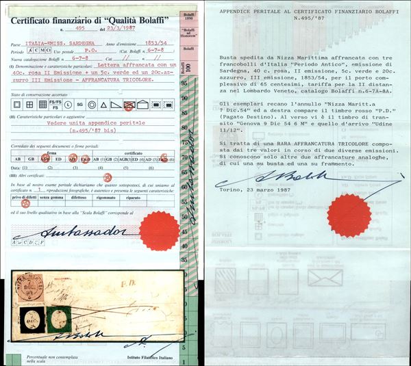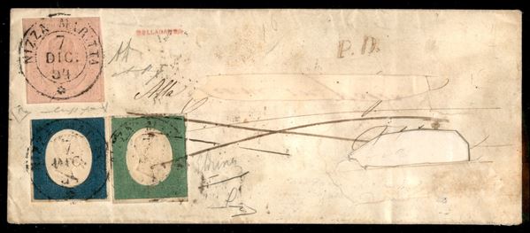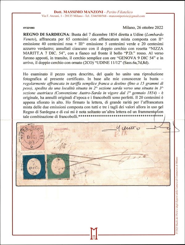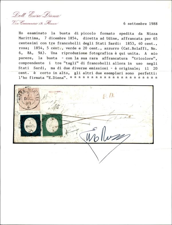 Lettera tricolore in affrancatura mista con 40 cent rosa II emissione + 5 cent verde III emissione + 20 cent azzurro (6 + 7 + 8) da Nizza Maritt.a 7 DIC. 54 a Udine in tariffa dalla seconda distanza Sarda alla terza distanza Austriaca - di questa combinazione è noto un frammento e un'altra lettera oltre a questa - indirizzo ritagliato e minimi difetti ma insieme di grande rarità - cert. Enzo Diena + Manzoni + Bolaffi