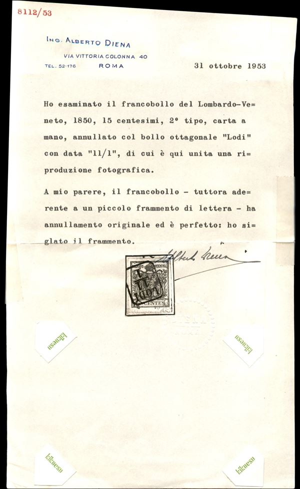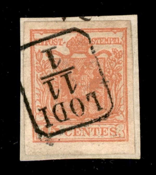 Lodi (Rd - P.ti R3) - frammento del 11.1 affrancato con 15 cent carta a mano secondo tipo (5) - solo due lettere conosciute - firma Vaccari + cert. A. Diena