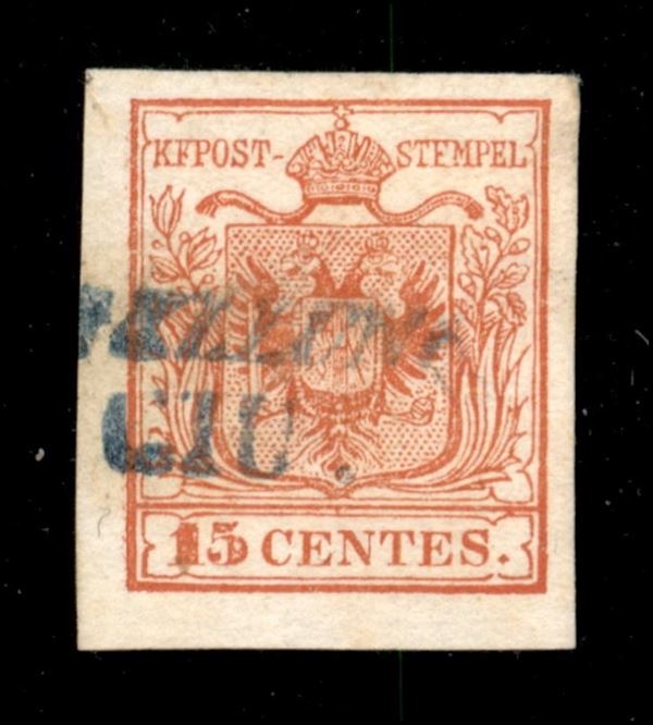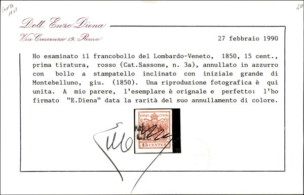 Montebelluna (stampatello inclinato - P.ti R3) - 6.1850 primo mese d'uso su 15 cent primo tipo prima tiratura (3a) - cert. E. Diena