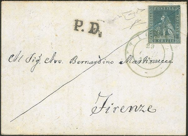Pitigliano (doppio cerchio azzurro P.ti R1+) + tratto a penna su 2 crazie azzurro verdastro su azzurro (5e) su lettera per Firenze del 29.6.52 - PD a lato - fresca e molto bella - Raybaudi + Bottacchi + cert. Diena
