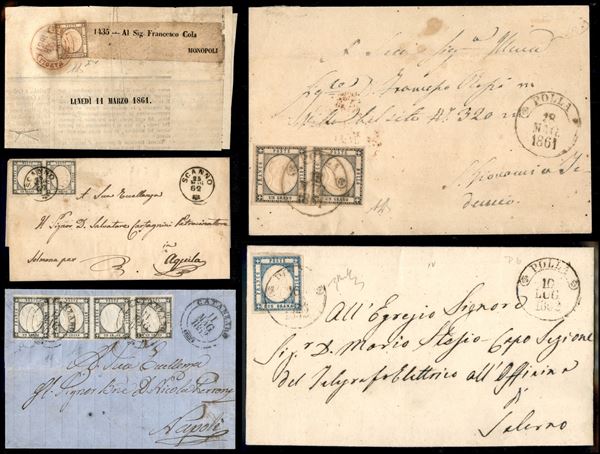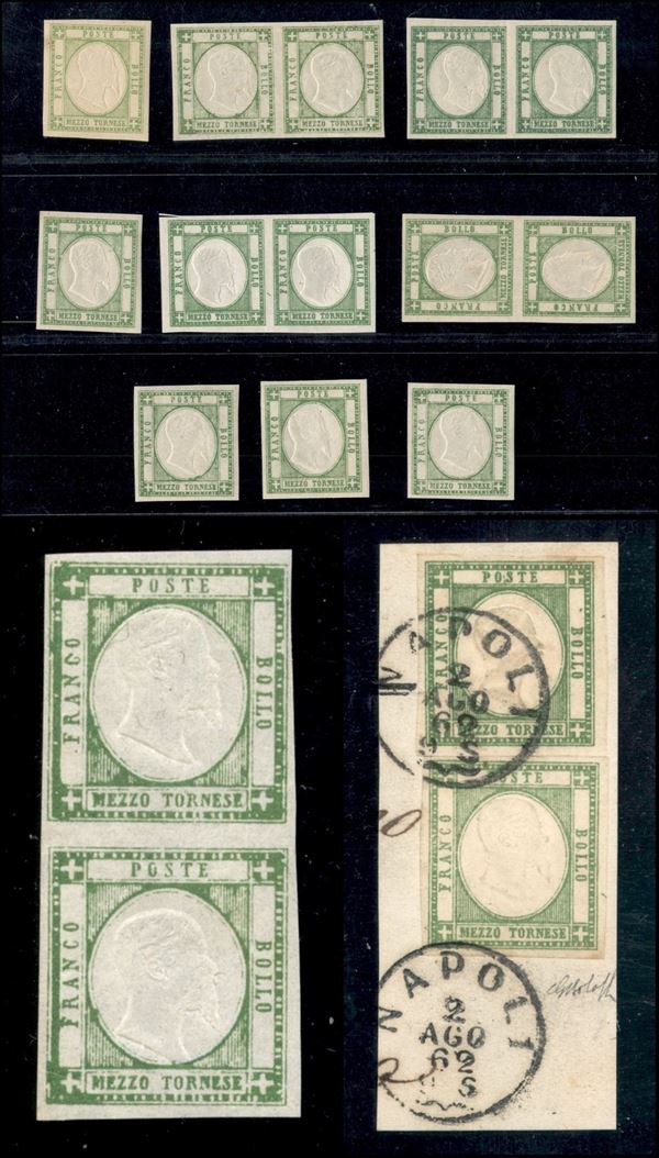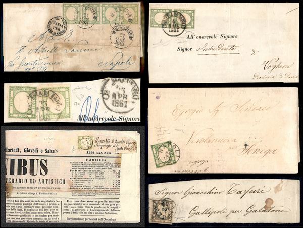 PROVINCE NAPOLETANE - 1861/1862 - Collezione di 14 esemplari del 1/2 tornese singoli e in coppia pił 2 frammenti 7 lettere 2 fascette e 1 giornale affrancati con 1/2 tornese 1/2 grano e 1 grano - notata bellissima coppia del 1/2 tornese verde di tinte diverse e rara fascetta con uso isolato del 1/2 tornese pił diversi certificati - considerevole valore di catalogo - merita esame