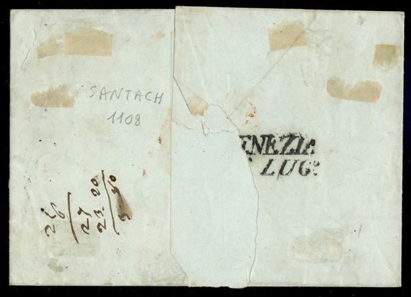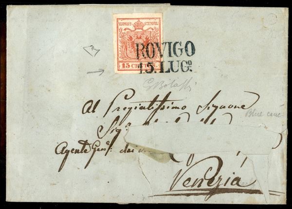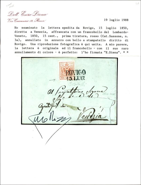 Rovigo (stampatello dritto - P.ti 11) - lettera del 15.7.1850 per Venezia affrancata con 15 cent primo tipo prima tiratura carta a mano (3a) - firma Bolaffi + cert. E. Diena