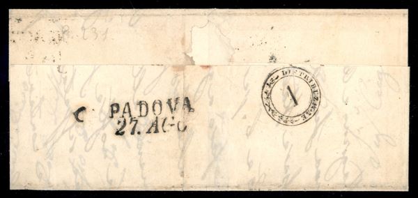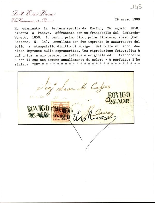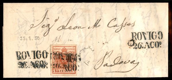 Rovigo (stampatello dritto - P.ti 7) - lettera del 26.8.1850 per Padova affrancata con 5 cent primo tipo prima tiratura carta a mano (3a) - cert. E. Diena