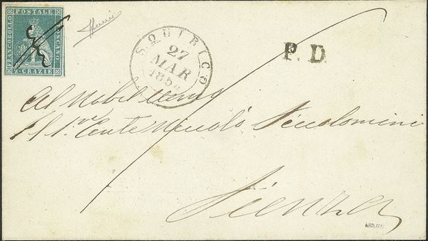 S. Quirico (doppio cerchio grande) + tratti a penna (P.ti R1) su 2 crazie (5) su lettera per Siena del 27.3.54 - PD a lato - fresca e molto bella - Bolaffi + cert. Sorani