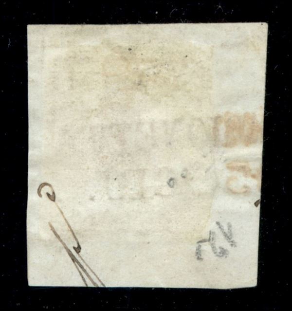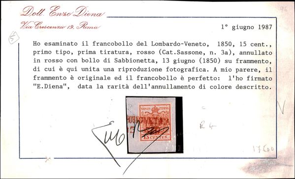 Sabbionetta (stampatello dritto - P.ti R4) - frammento del 13.6.1850 tredicesimo giorno d'uso con 15 cent primo tipo prima tiratura carta a mano (3a) - firma Fiecchi + cert. E. Diena