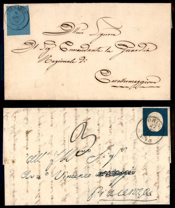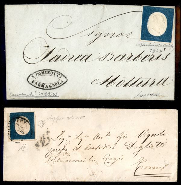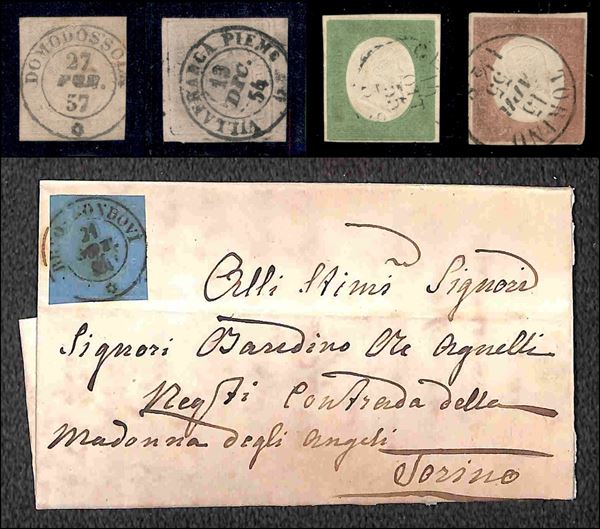 SARDEGNA - 1853/1854 - II e III Emissione - Insieme di 4 valori usati pił 5 lettere con affrancature singole del periodo - notato 5 cent con doppia impronta e bella lettere con 20 cent non annullato e una rara destinazione - diversi certificati - considerevole valore di catalogo - merita attento esame