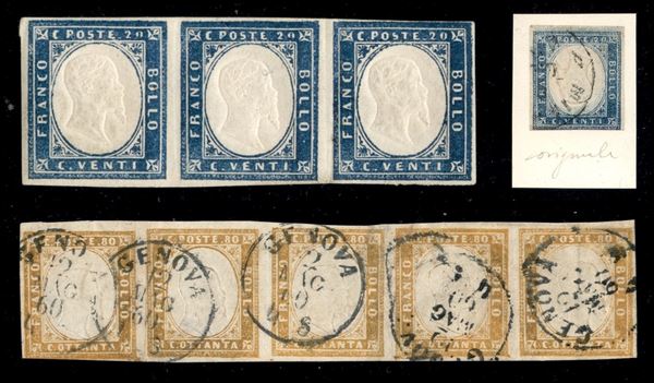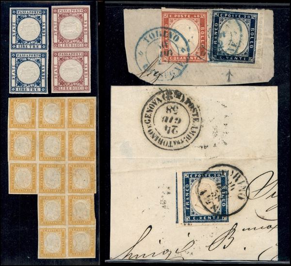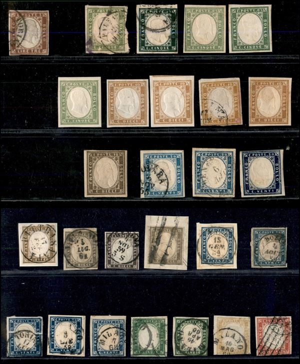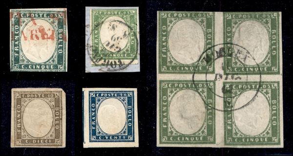sardegna - 1855/1861 - IV Emissione - Piccola collezione di valori nuovi e usati del periodo di buona/ottima qualità montati su cartoncini - notata quartina del 5 cent verde oliva striscia di tre del 20 cent azzurro striscia di cinque del 80 cent giallo arancio chiaro e un 3 lire usato con certificato - elevato valore di catalogo - merita esame