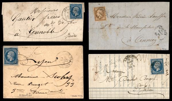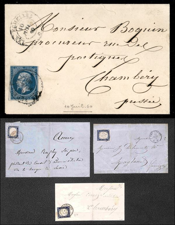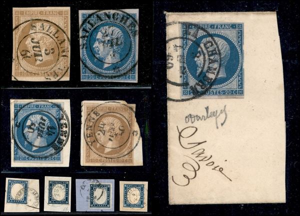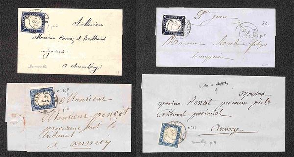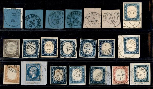 SARDEGNA - Annullamenti - Piccola collezione di 12 oggetti postali pił 30 esemplari usati e su frammento con annulli di Savoia su Sardegna e Francia - notate impronte molto rare - ottima qualitą - merita esame