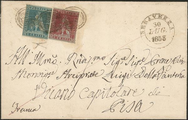 Serravezza ( muto a sigillo ovale con monogramma "IL" P.ti R1) ripetuto tre volte su 1 crazia carminio azzurro + 2 crazie azzurro vivo su azzurro (4b+ 5b) pił doppio cerchio a fianco di lettera per Pisa del 30.7.53 - splendida e fresca lettera - cert. Bottacchi