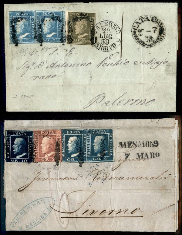 SICILIA - 1839/1859 - Splendido insieme composto di 2 prefilateliche "incoming mail" pił 4 lettere con interessanti e non comuni affrancature dell'emissione di Sicilia - notate due tricolori e diversi certificati - elevatissimo valore di catalogo - merita attento esame
