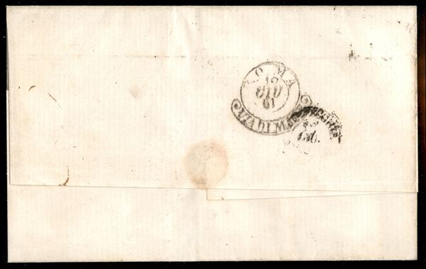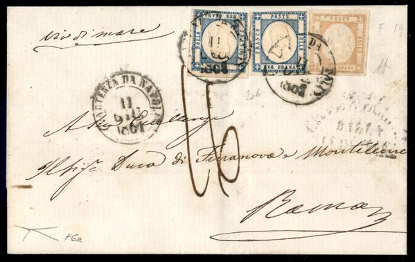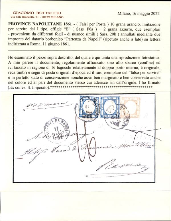 Sovracoperta di lettera affrancata con 10 grana arancio falso per posta del I tipo effige B perfetto e ben marginato + due 2 grana azzurro (F6a + 20b) da Napoli 11 GIU 1861 a Roma - bollo via di mare di Civitavecchia - tassata 16 bajocchi - rara - Cert. Bottacchi