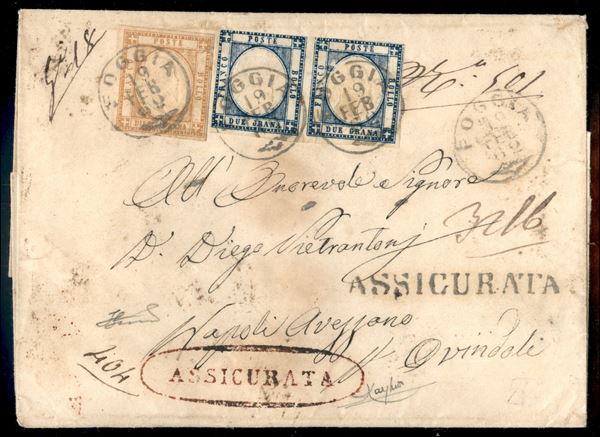 Sovracoperta di lettera assicurata affrancata con 10 grana bistro + coppia orizzontale del 2 grana azzurro (22d + 20b) - difetti - da foggia 19 FEB 62 per Avezzano - Sul fronte sono eccezionalmente presenti due tipologie di bollo "assicurata" di fogge e colori differenti - interessante e molto rara