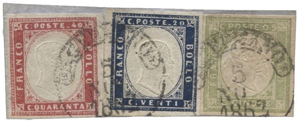 Splendido frammento da S. Germano 5.11.62 recante un 40 + 20 cent Sardegna + 5 cent non emesso Province Napoletane (piccola piega d'applicazione) - unico caso noto di non emesso in affrancatura mista in Tricolore - grande rarità - cert. AD esteso + cert. Colla - (Sard. 16E + 15E + 1)