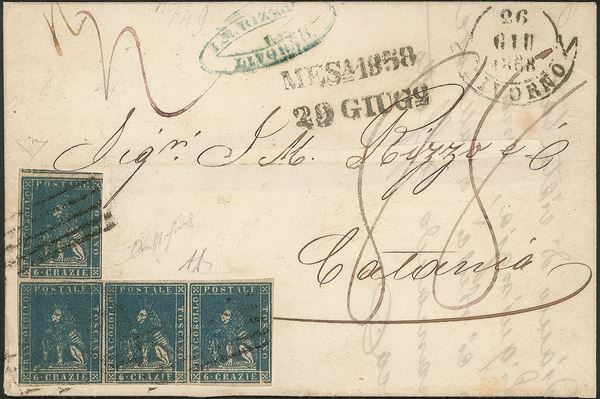 Striscia di quattro "a Seggiola" del 6 crazie (15) annullata con muto a 5 sbarre + cerchio a banderuola di Livorno su lettera per Catania del 26.6.58 - parte di indirizzo ricostruito - Fiecchi + cert. Diena