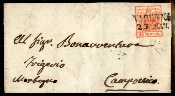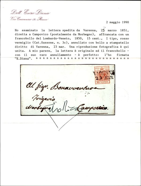 Varenna (stampatello dritto - P.ti 13) - lettera del 23.3.1851 per Campovico affrancata con 15 cent primo tipo (3e) - cert. E. Diena