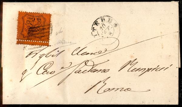 10 cent (26) con interspazio di gruppo in alto su lettera da Viterbo a Roma del 10.9.1868 - AM. Diena + Cert. Avi