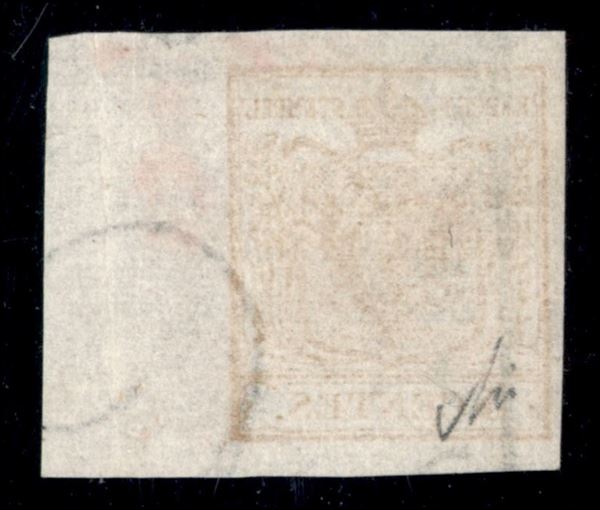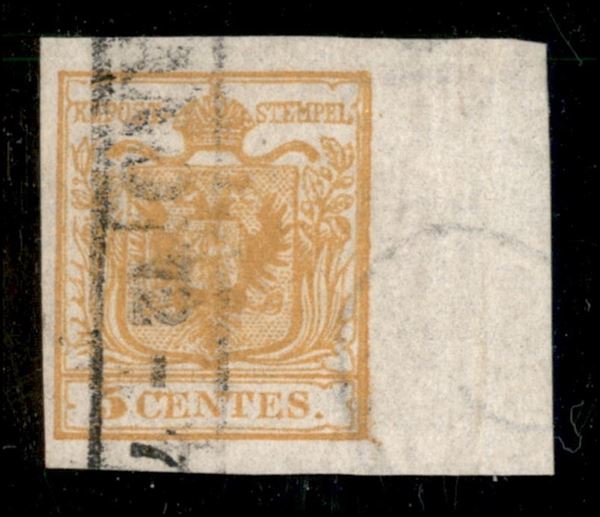 1850 - 5 cent ocra arancio(1e) - bordo foglio a destra con filigrana - usato a Milano - cert. Avi