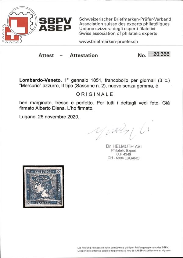 1851 - 3 cent (2 - per giornali) - nuovo senza gomma - Cert. Avi