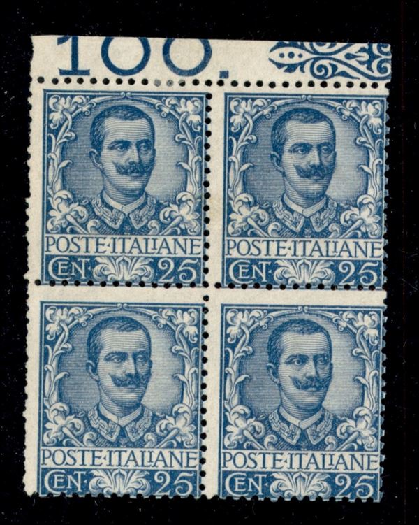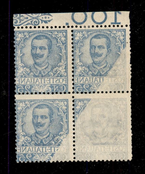 1901 - 25 cent Floreale in quartina con decalco (73q) senza gomma