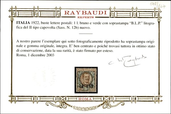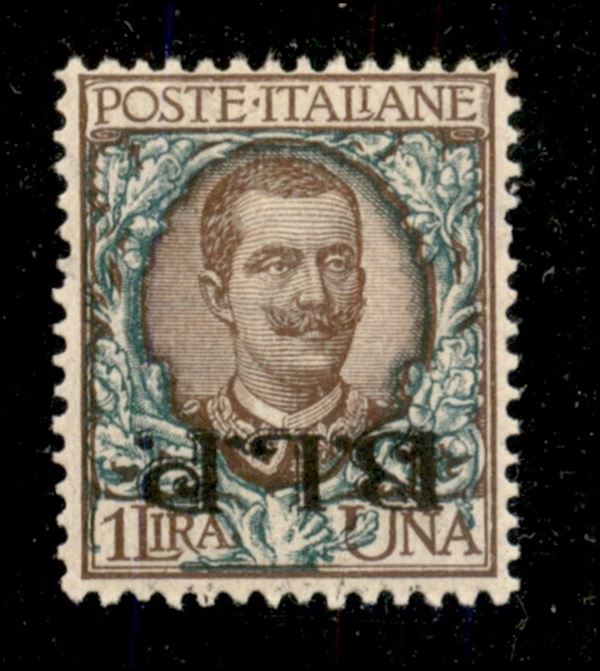 1922 - B.L.P. - 1 lira bruno e verde soprastampa tipografica del II tipo capovolta (13b) - esemplare ben centrato nuovo con gomma integra - cert. oro Raybaudi