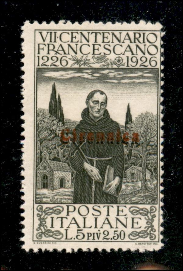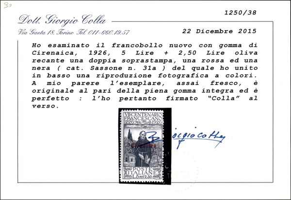 1926 - 5 lire S. Francesco (31a) - doppia soprastampa bicolore - gomma integra - cert. G. Colla