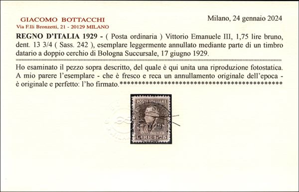1929 - 1,75 lire Vittorio Emanuele III dentellato 13 3/4 (242) - annullato con bollo a doppio cerchio di Bologna Succursale in data 17 giugno 1929 - cert. Bottacchi