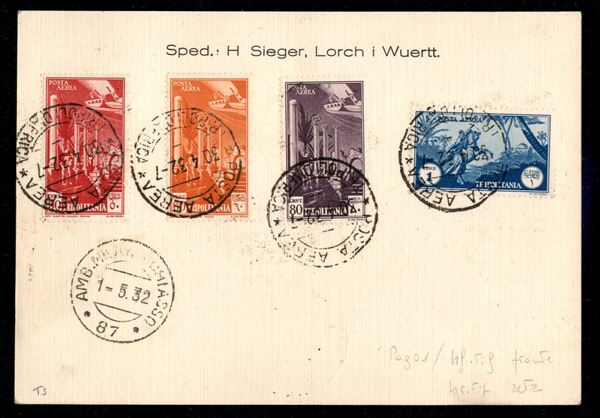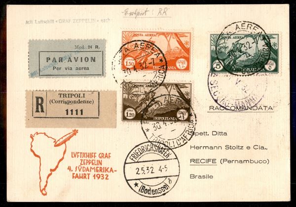 1932 - Graf Zeppelin 4° Sudamerikafahrt cartolina raccomandata da Tripoli d'Africa Posta Aerea 30.4.32 per Recife affrancata recto verso con Tripolitania Posta Aerea sette valori (A9/10 + A12/16)