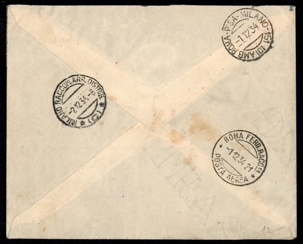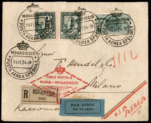 1934 - Volo di Ritorno Mogadiscio Roma - aerogramma affrancato con Somalia Aerea lire 25 (+2) verde + Pittorica due esemplari cent 25 verde (172 + A16) con annulli speciali