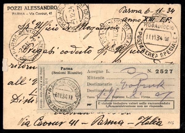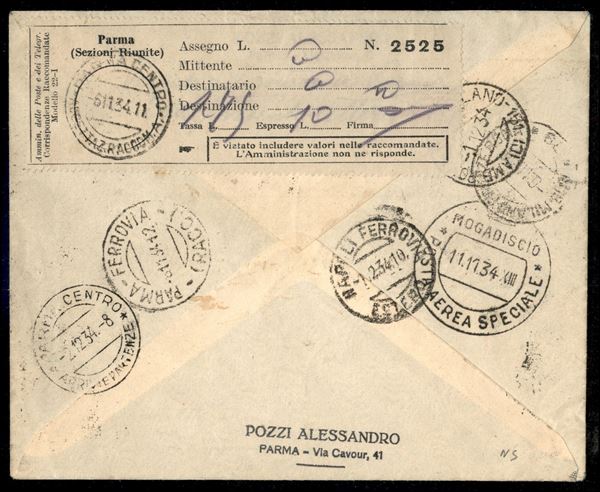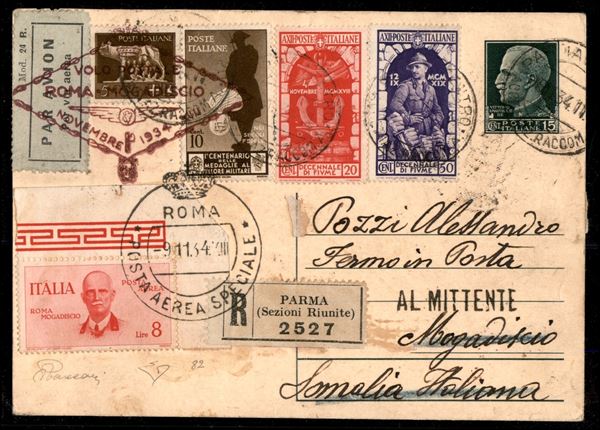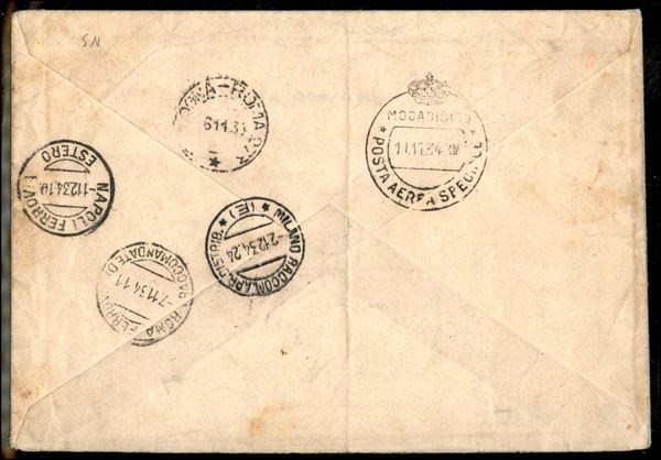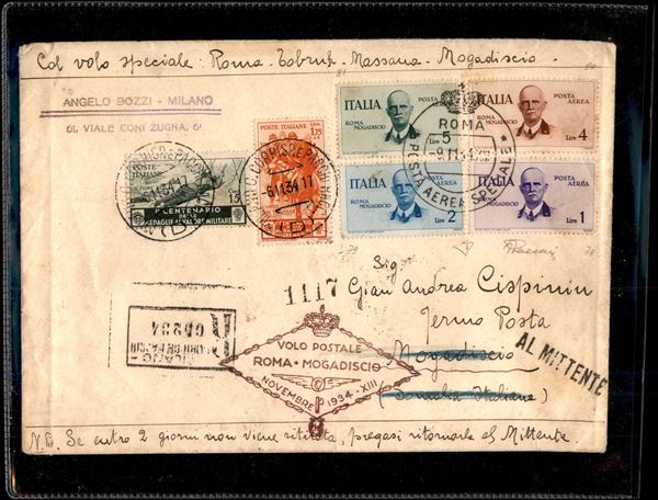 1934 - Volo Roma Mogadiscio - la serie completa di Posta Aerea su due aerogrammi ed una cartolina (A83/88) - tutte con firme ED e Vaccari