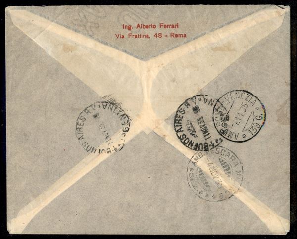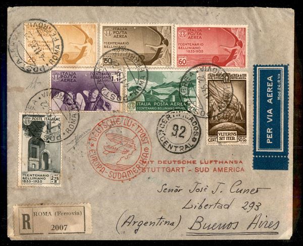 1935 - Aerogramma raccomandato per Buenos Aires da Roma 4.11.35 viaggiato con bollo lineare Mit Deutsche Lufthansa Stuttgart - Sud America e affrancato con Bellini 2,75 (+ 2) lire verde oliva + Bellini Aerea serie completa + Milizia IV Emissione 50 cent + 50 bruno (393 + A89 + A90/94) con bolli d'arrivo al verso