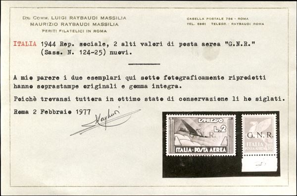 1944 - GNR Verona - Posta Aerea (A117/125) nuovi con gomma integra - 10 lire e 2 lire Aeroespresso firmati Oliva + cert. Raybaudi