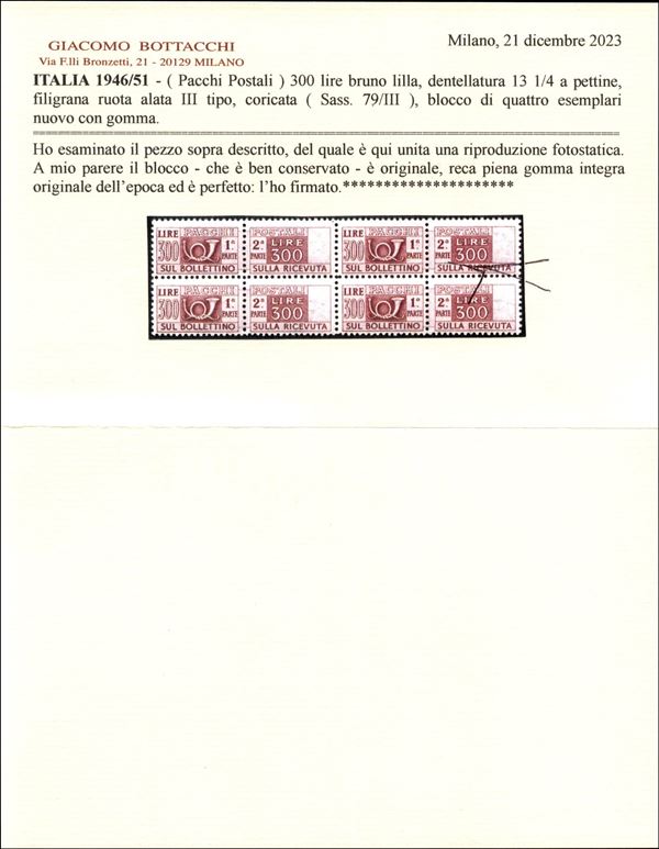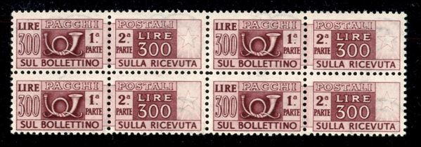1946/1951 - Quartina del 300 lire bruno lilla Pacchi Postali dentellata 13 1/4 a pettine (79/III) - nuova con gomma integra - buona centratura - cert. Bottacchi