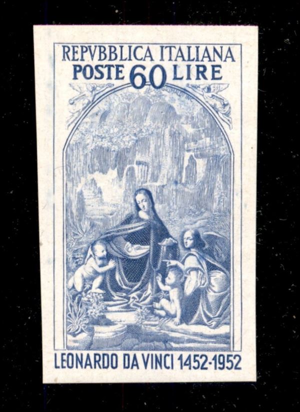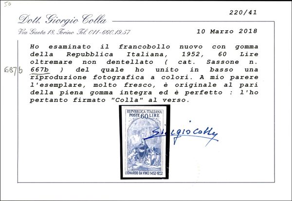 1952 - 60 lire Leonardo non dentellato (687b) - gomma integra - Bolaffi + cert. Colla