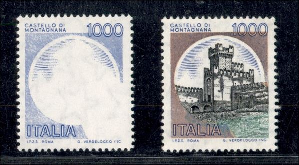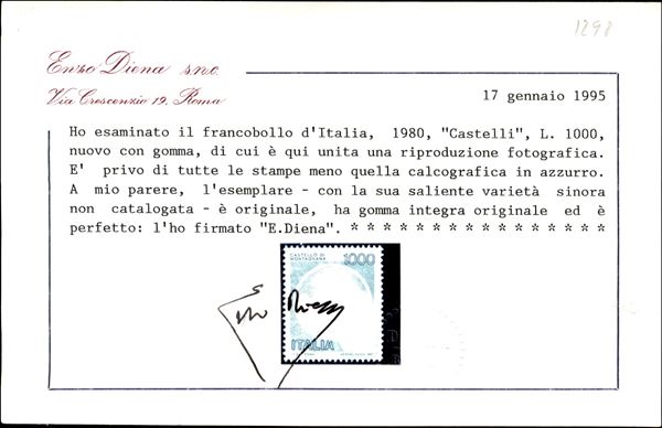 1980/1992 - 1000 lire azzurro Castelli - francobollo naturale privo della stampa del bruno del verde e del nero (1527 var.) - splendido - cert. E. Diena