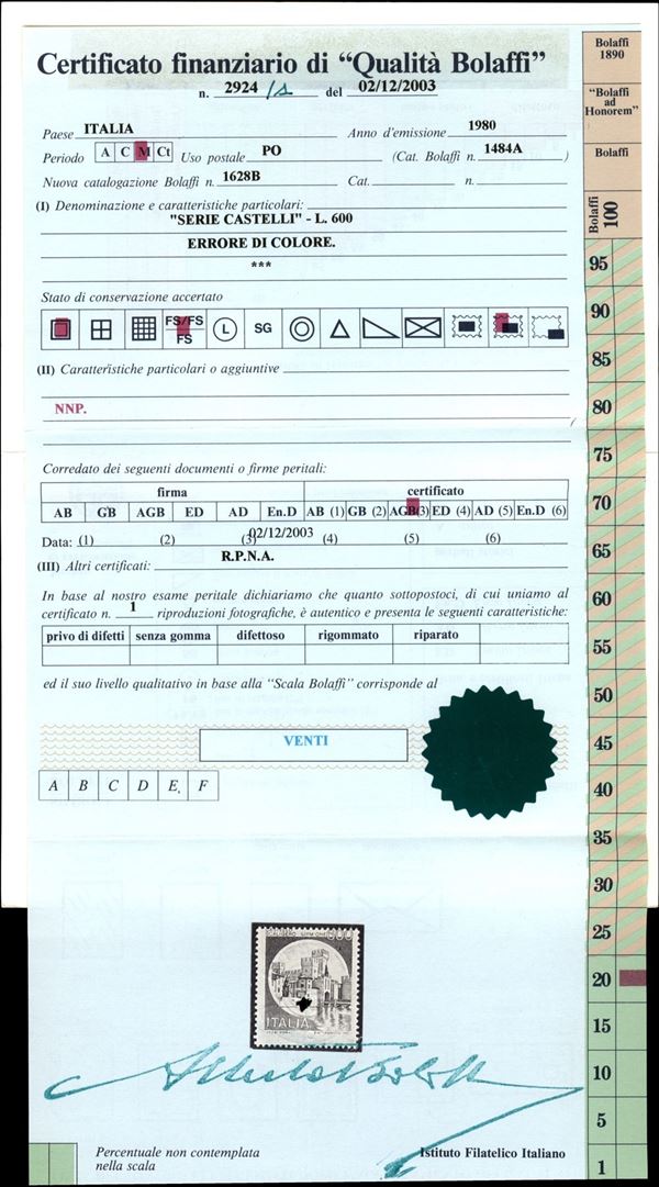 1980/1992 - 600 lire nero Castelli privo della stampa del celeste (1523 var.) - gomma integra - splendido - cert. Bolaffi