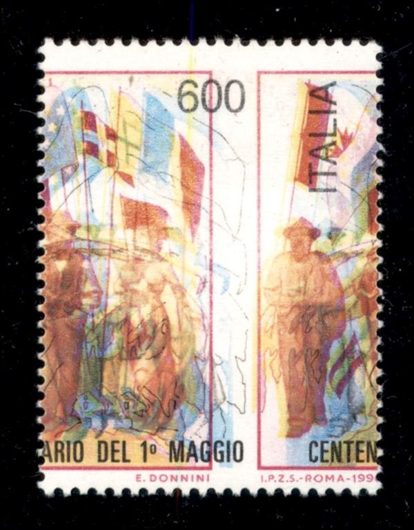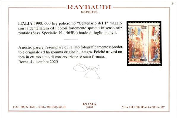 1990 - 600 lire Festa del Lavoro (Spec. 1565Ea) con dentellatura e colori fortemente spostati in senso orizzontale - cert. Raybaudi