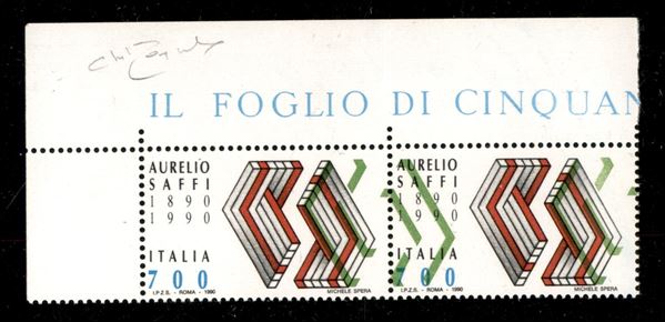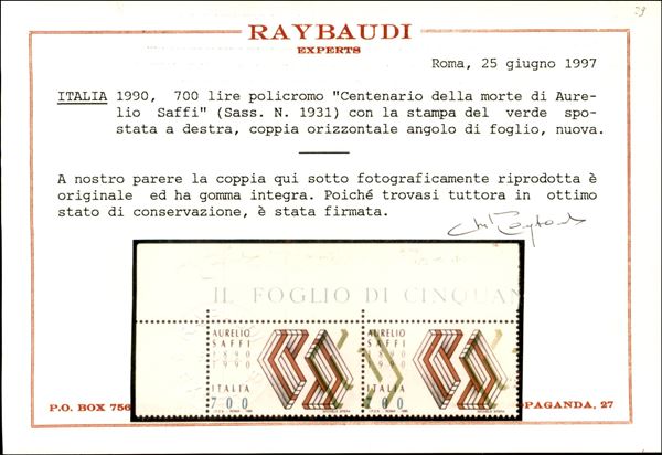 1990 - coppia del 700 lire Aurelio Saffi (Spec. 1563Aa) con stampa del colore verde fortemente spostata - cert. Raybaudi