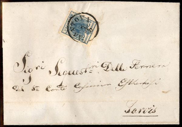 45 cent (17be) azzurro oltremare - carta a coste verticali - lettera da Mantova a Treviso del 7.5.1854 - cert. AG