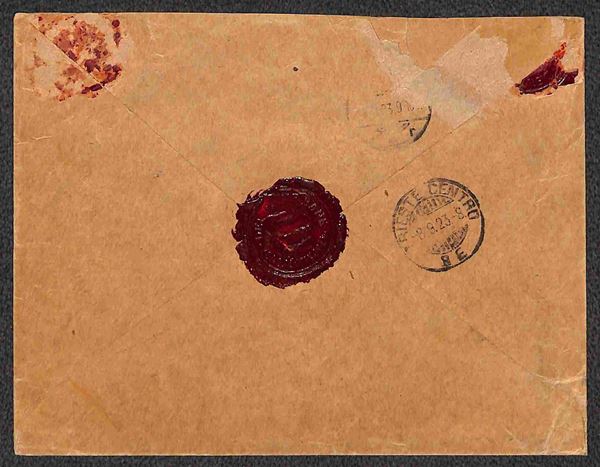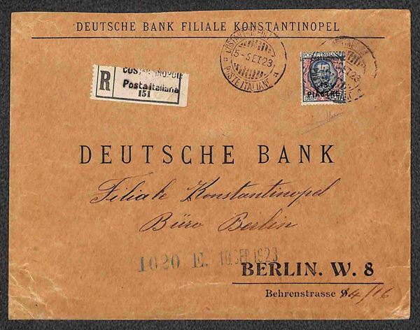 45 piastre su 5 lire (83d) con soprastampa spostata (i a sinistra) isolato su raccomandata per Berlino del 5.9.1923 - S. Sorani