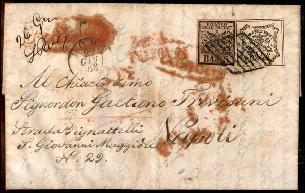 5 bai (6Ad - senza E) + 8 bai (9 - cornice rotta sopra B di Bollo) - Franca (ovale annullatore) + Roma Franca (in rosso) raccomandata per Napoli del 22.6.1858